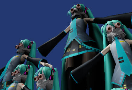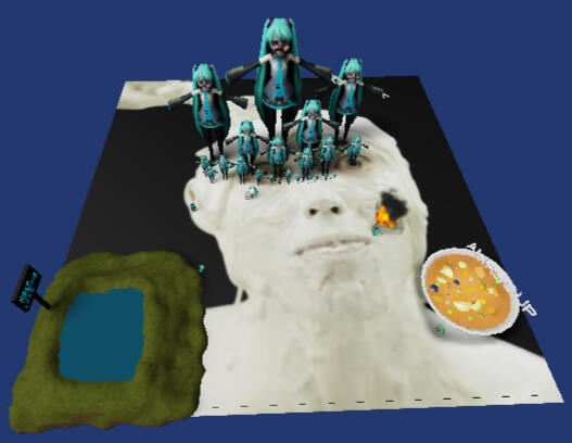 Our main attraction! Everynight we pray to her and her sisters. We give her the remains of those who drown in the lake, tell Hatsune Beeku they had a bad day, tell Hatsune Beeku they disapprove of the burnings, or ask Hatsunegg Miku for Cola as a sacrifice. We wear her hair as necklaces for goodluck. She loves Little Baby's Icecream, and we love her.